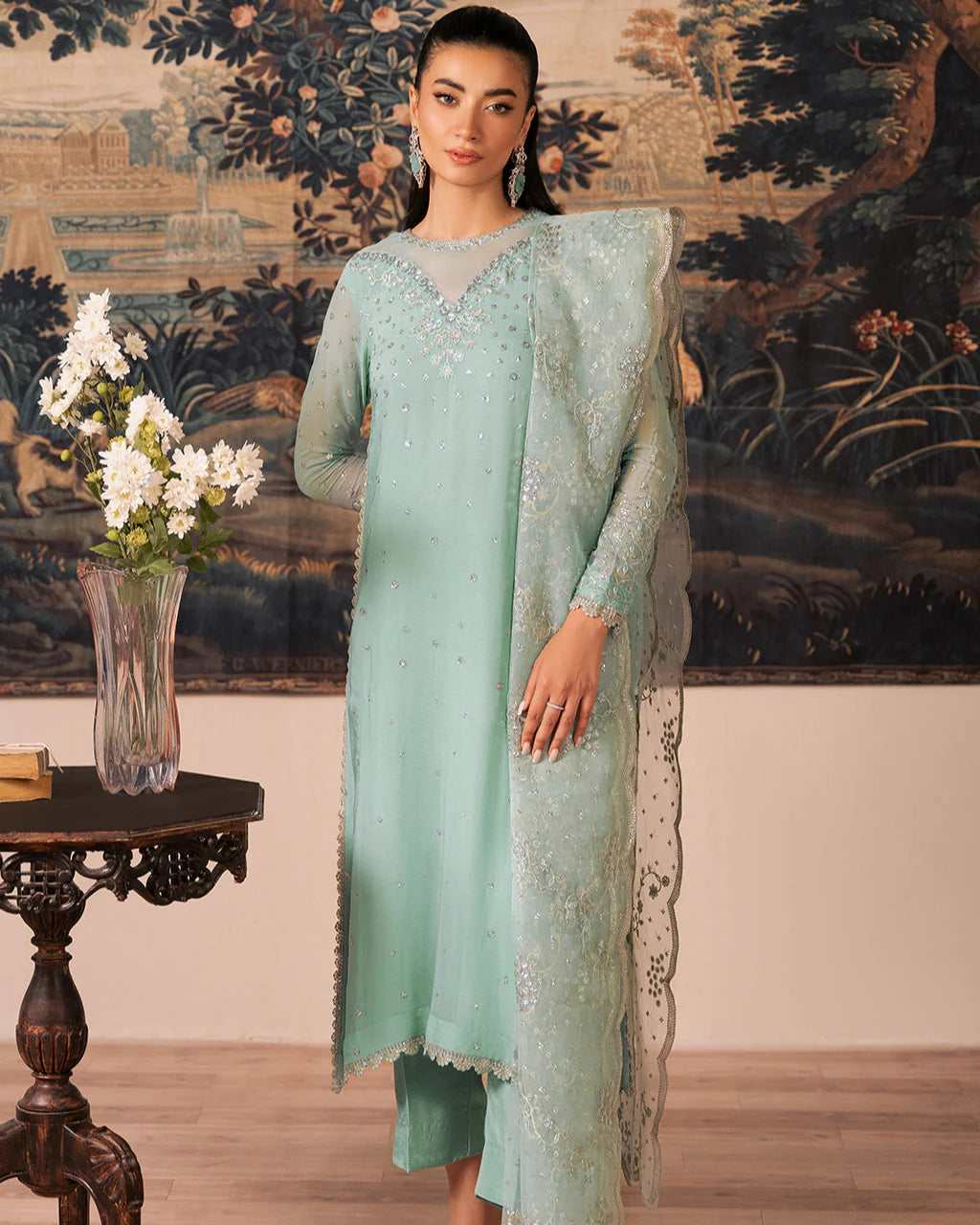 Work: This exquisite shirt features delicate embroidery work, highlighted by intricate tilla and sequin details. The design is further elevated with laser-cut work along the daman borders, adding a touch of sophistication. The ensemble is paired with a plain raw silk trouser and complemented by an organza dupatta, which is adorned with finely embroidered pallus and borders, creating a harmonious blend of elegance and tradition,