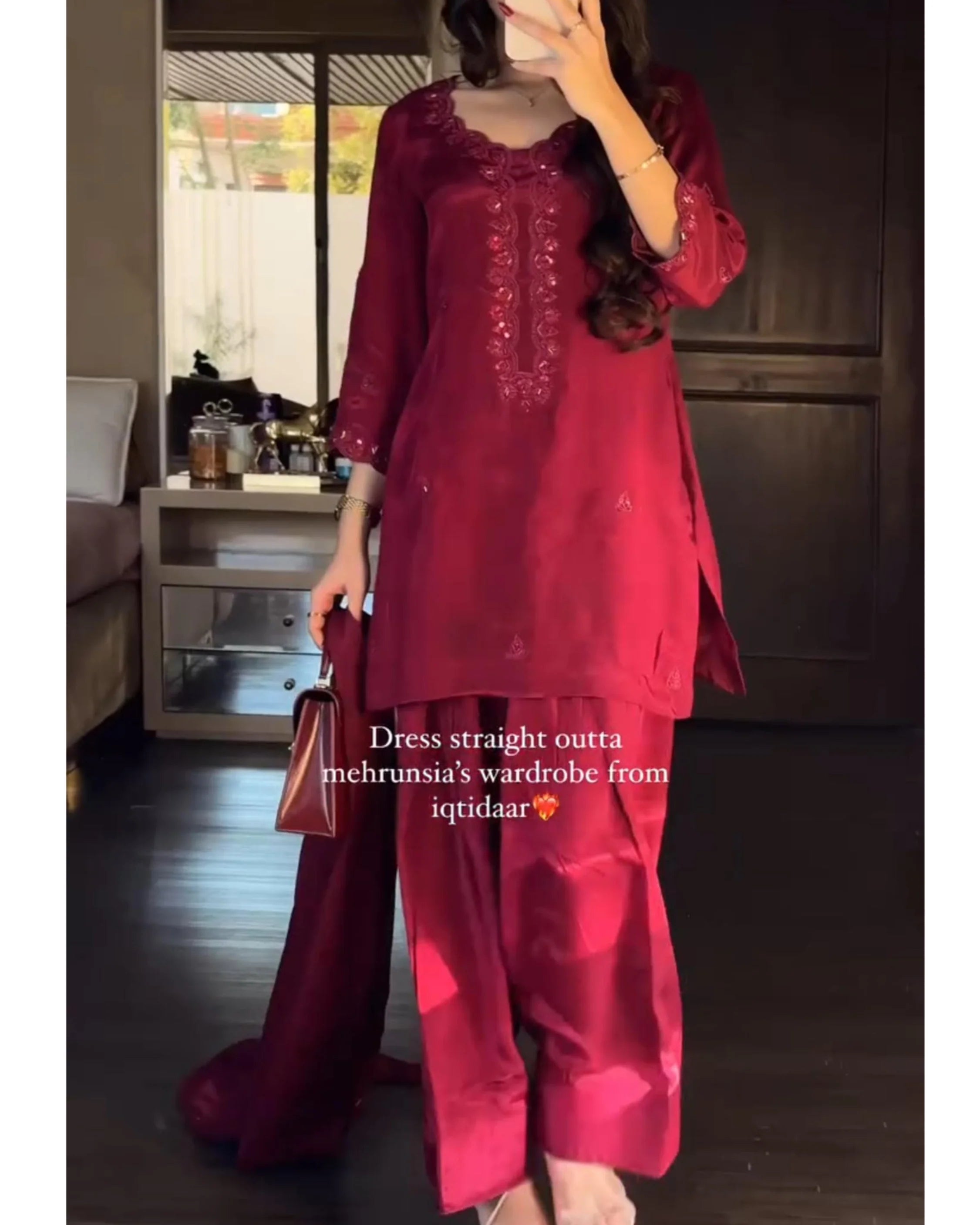 This is a premium quality soft rawsilk 3-piece stitched ensemble.